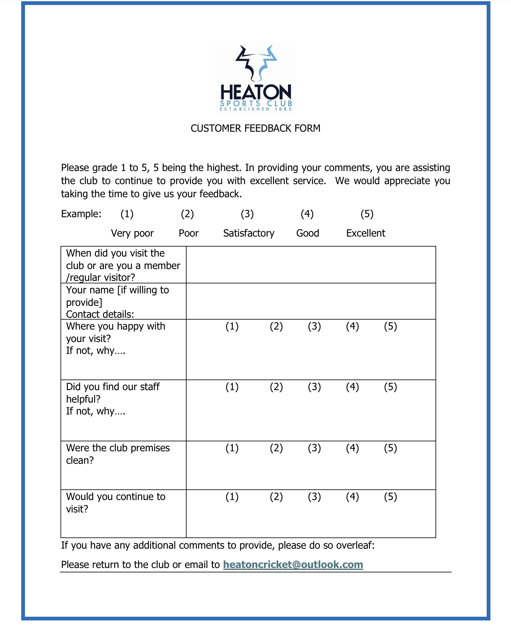 Your feedback helps us become even better. If you have feedback which you would like to share with us please do so using the form provided or alternatively email heatoncricket@outlook.com